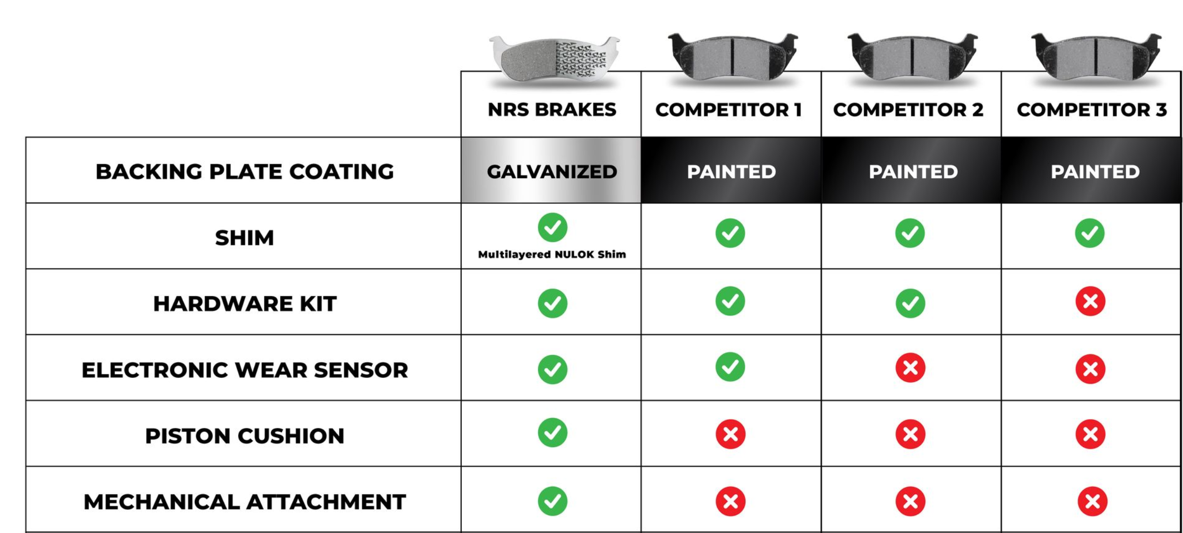 Premium Galvanized Disc Brake Pad Set - Front NRS brake pads feature zinc plated protection to prevent corrosion and in-situ hooks (called NRS®) on the backing-plate surface. These hooks provide mechanical retention of the friction material, overcoming inadequacies of adhesive usage.Premium Galvanized brake pads by NRS Brakes have a technology that you can see. Rust resistant, unpainted Galvanized Steel that incorporates an award winning, patented attachment technology. The result are the worlds quietest, safest and longest lasting brake pads. Galvanized Steel that outlasts the friction. Wont fail as a result of corrosion With Electronic Wear Sensor With Noise Cancelling Piston Cushions With Complete Hardware Kit Rust Free, Quietest, and Longest Lasting Disc Brake Pads Made In Canada